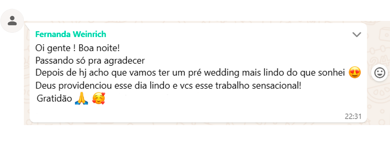 Nós realizamos apenas o teaser do Pré Wedding, que é um vídeo pequeno de 1 a 2 minutos com um resumo do ensaio, o filme completo (longa metragem) de casamentos não trabalhamos ainda, mas podemos indicar profissionais específicos para a tarefa.