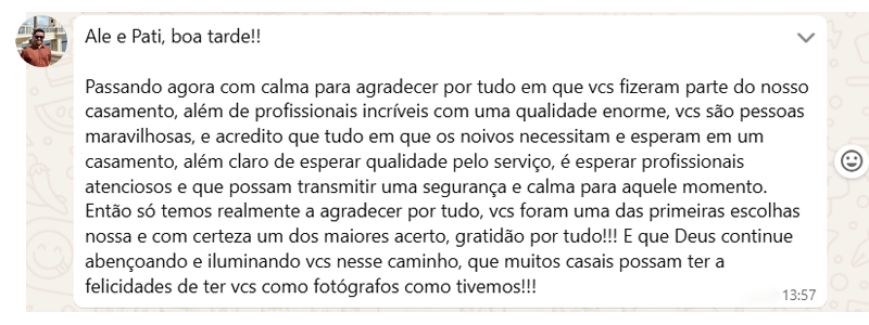 Vocês planejaram cada detalhe do casamento com cuidado. O lugar, a data, as pessoas, os sentimentos. O que muitas pessoas só percebem depois… é que as fotos são a única coisa que permanece exatamente como foi vivido. Nosso trabalho é garantir que, daqui a 10, 20 ou 30 anos, vocês sintam tudo novamente.